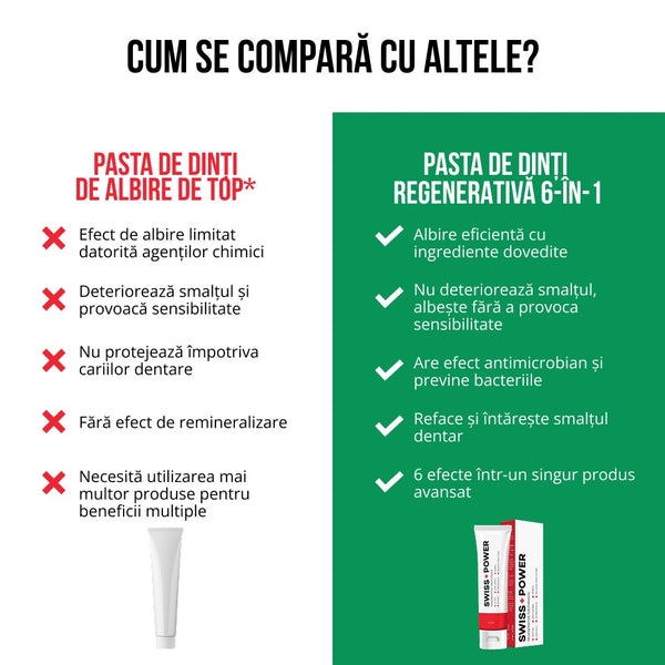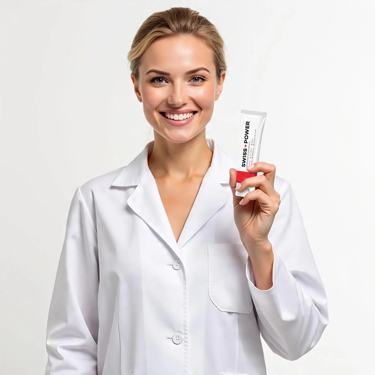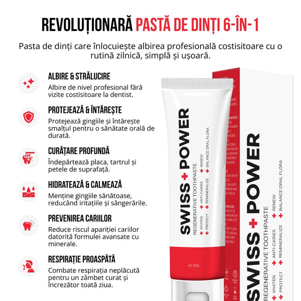 „Recomand pacienților mei pasta de dinți regenerativă 6-în-1 SWISS+POWER pentru o îngrijire orală completă, care combină prevenția, protecția și regenerarea într-un singur produs practic.”